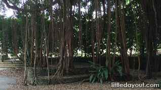 Tucked away under leafy foliage and cloaked by hanging roots, this quiet sitting corner is easily missed, even by those visiting the nearby Frangipani Grove and iconic white bandstand. For those who can find it, take a seat under the shady tree and sit back for a while to watch the world pass by from this little hidden spot at the Singapore Botanic Gardens.