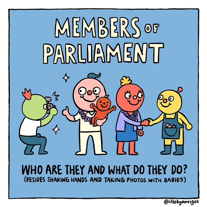 We love the infocomics by Ann Gee found here. It details the role of an MP in a way that is very easy to understand.