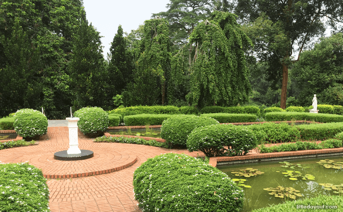 This tranquil sundial garden was originally laid out in 1929 by the Director of the Botanic Gardens Eric Holttum whose wife designed the sundial with its enigmatic inscription. Four water lily tanks were added in the 1970s and four Grecian statues in 2006.