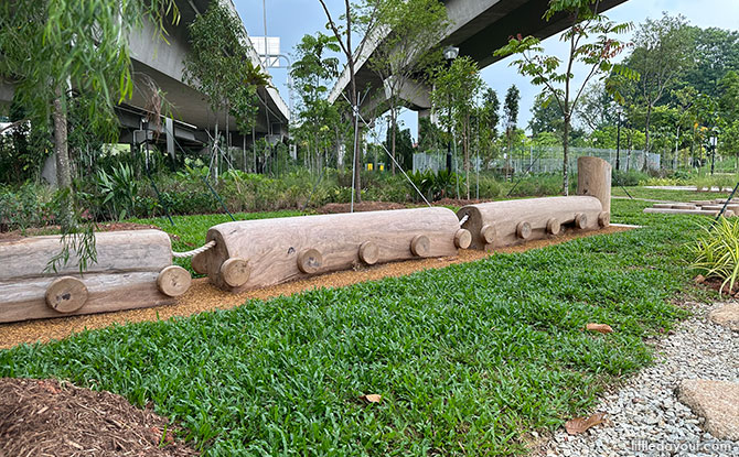 The new Villa Verde Park playground is a bright and colourful structure. Inspired by the adjacent Rail Corridor, it looks like a train with various carriages lined up in a linear fashion. The Villa Verde Park Nature Playgarden also takes inspiration from the trains that once ran from Singapore to Malaysia. Wooden logs create a make-believe train and also act as balancing beams that kids can walk along.