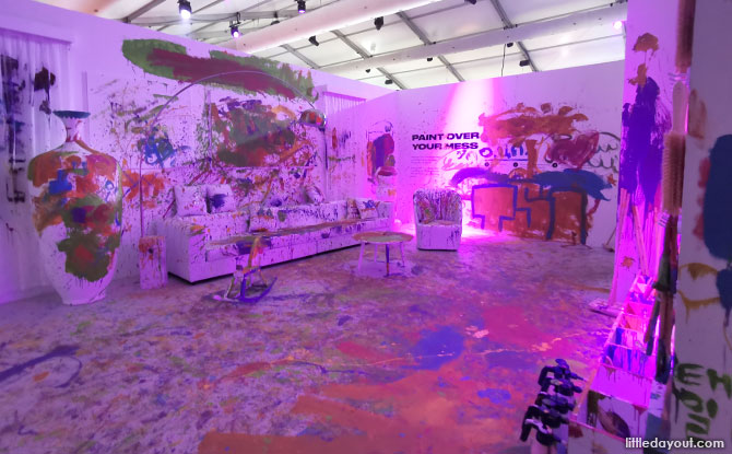 Paint Over Your Mess invites visitors to vandalise the room with colourful paints and paint tools including huge brushes. Doodle, splash and make a legit mess!