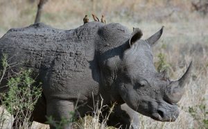 In the wild, you might spot some feathered friends hitching a ride on a rhino. The Oxpeckers have a symbiotic (give and take) relationship with rhinos. Rhinos have a host of ectoparasites on their hide that the birds eat as a source of nutrition while keeping the rhino free of parasites.