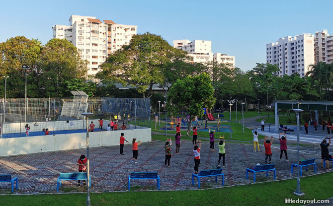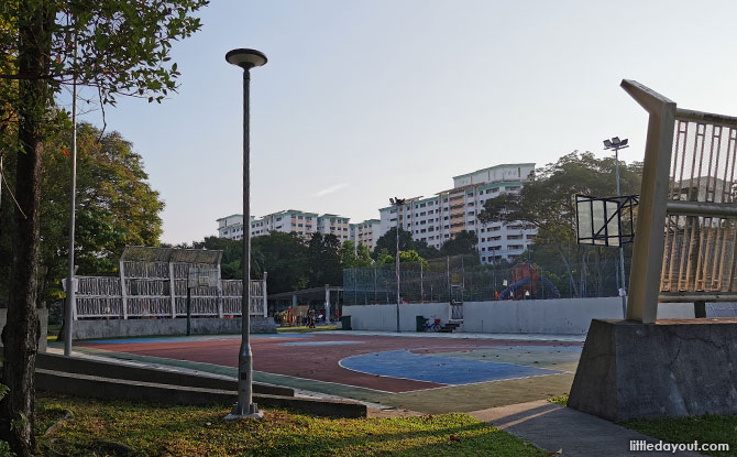 Avid sports fans will enjoy this park as it has plenty of amenities side by side. The futsal court and basketball court are next to each other. There are also three exercise corners and plenty of space to practise dance or inline-skating with a sheltered multi-purpose court and an open-air space.