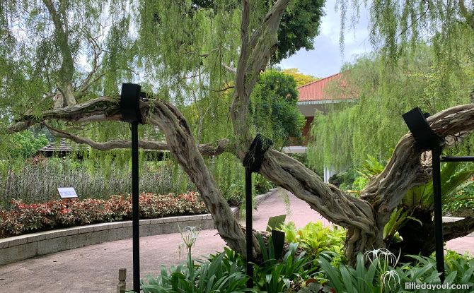 It was chosen as Singapore’s national flower in 1981 from among 40 flowers for its vibrant colours, hardiness and resilience. The Vanda “Miss Joaquim” blooms throughout the year and you can find a collection of them beside a Weeping Willow.