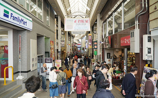 Arriving at the underground Nara station, we made our way up the escalators to the street level. From the top of the escalators, it was straight on to get to Nara Park, or a right turn to head down a covered shopping arcade.