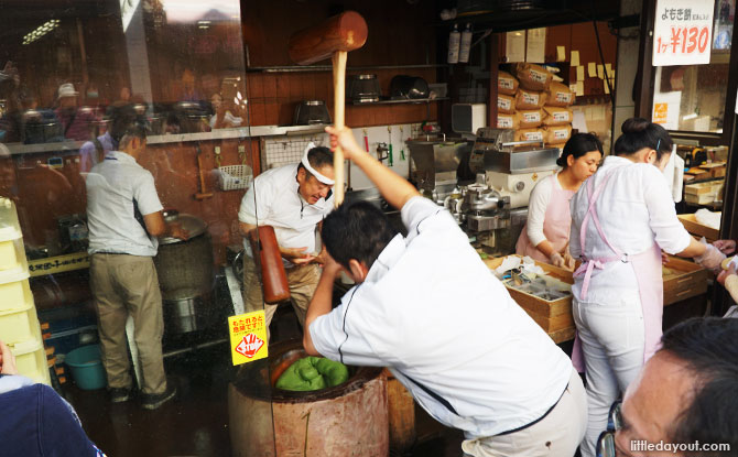 One store we particularly wanted to seek out was a confectionary selling freshly-made mochi. We didn’t have to look far. Not long after entering the Nara shopping area, we heard a loud thumping sound, repetitively beating away like a drum.