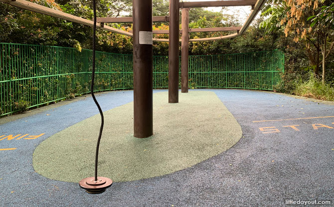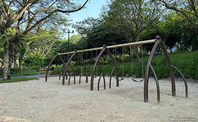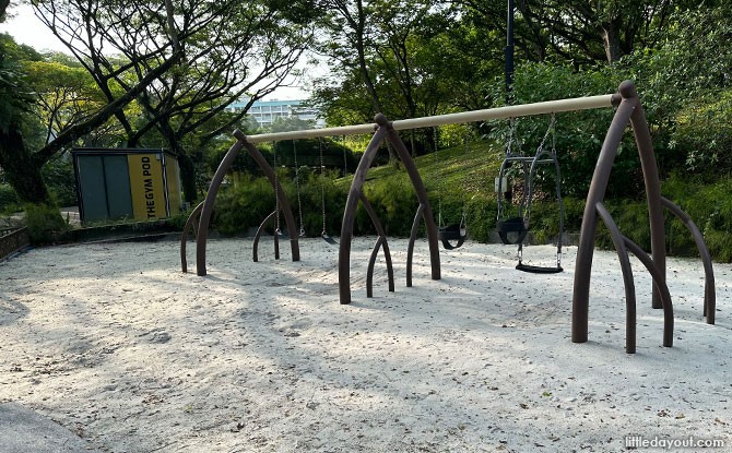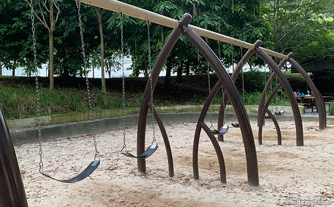 Admiralty Park children’s playground also has two sets of swings with a mangrove-roots motif frame.