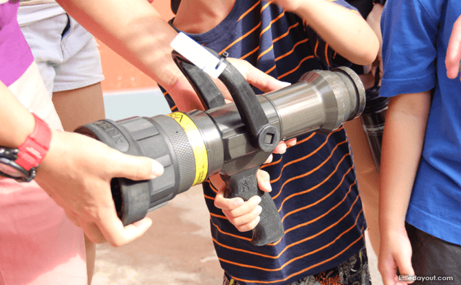 The highlight of the Fire Station Open House has got to be the water hosing demo, where the firefighters help the kids hold on to the hose and shoot powerful jets of water. This focused jet of water is very strong and can shoot very far.