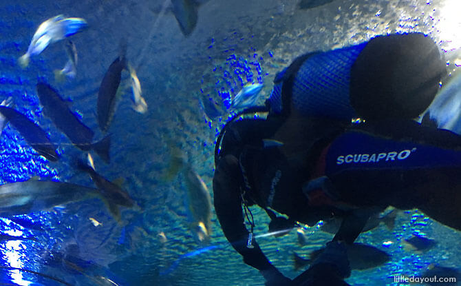 The Living Ocean zone is an underwater tunnel that provides visitors with an immersive view of fishes, sharks, rays and sea turtles.