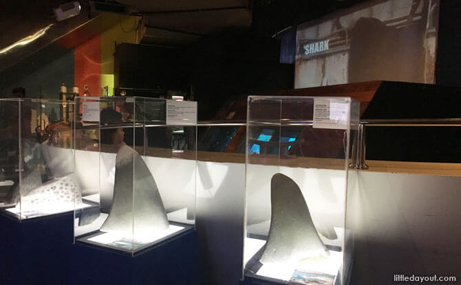 Stop by a display that educates about shark-fishing for the sake of their fins before heading up an escalator to the Aquaria KLCC Souvenier shop.