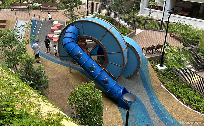 Situated at the bottom of the hilly terrain, the Pond Playground features various elements that the younger age set can appreciate.