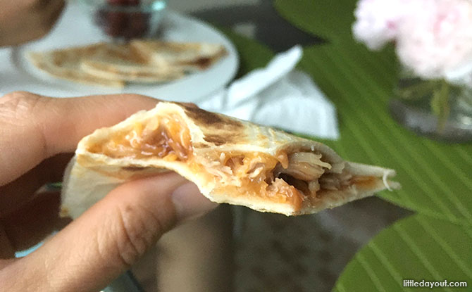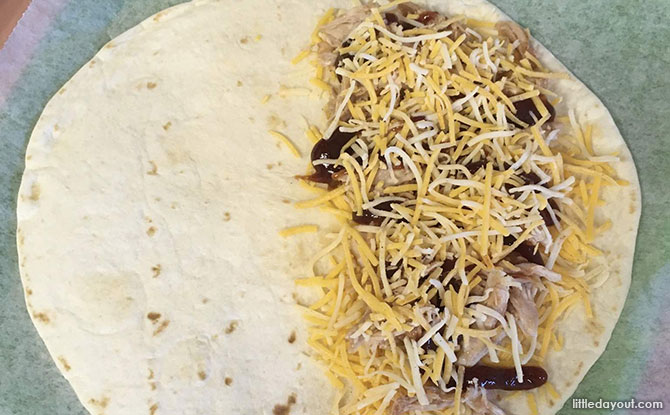 - Lay a piece of tortilla on a plate and sprinkle a thin layer of cheese on half of the tortilla, followed by a layer of shredded chicken. Apply some BBQ sauce on the chicken.