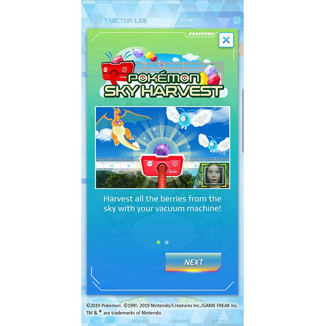 The activities in Pokémon Explorer include missions such as Pokémon Sky Harvest at the Level 5 Cloud9 Piazza where players need to use a vacuum to collect berries with the vacuum in order. The vacuum is controlled using mouth movements through facial recognition technology in the mobile app.