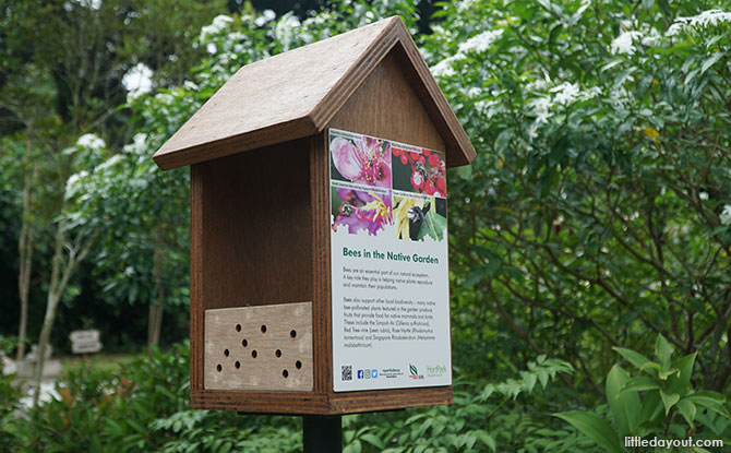 Along the Bee Trail at HortPark, wooden bee hotels double up as information posts. These educate visitors to the role of bees within the ecosystem and the various species of bees found in Singapore. They also act as a shelter for non-aggressive species of bees.