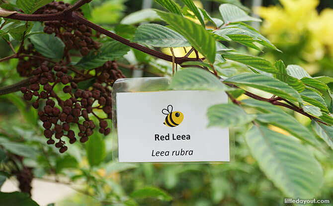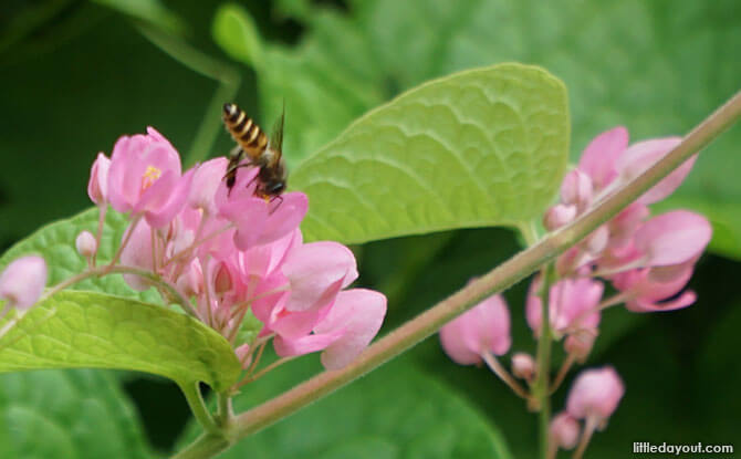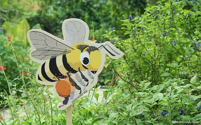 Bee-attracting plants, marked with a tag, lure the buzzing insects to these parts of the park. These bee-friendly plants include the Red Leea, Crepe Ginger and Blue Butterfly Bush. Butterfly-attracting plants like the Indian Snakeweed are also highly attractive to bees.