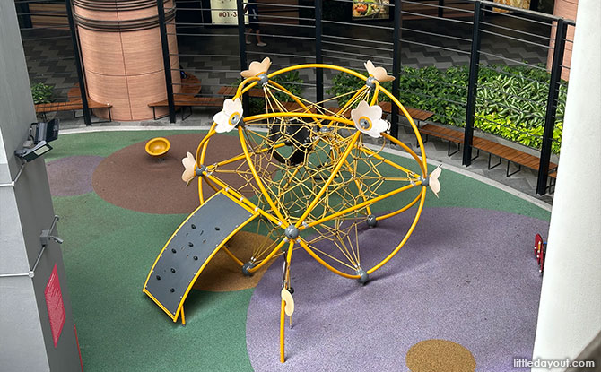 The Aperia Mall playground features a large yellow climbing sphere, a spot where kids can have some fun within its netted frame. Additional play equipment at the playground include play panels and smaller play equipment for younger kids. This free shopping mall playground may not be very large but it certainly offers some fun climbing challenges for kids to enjoy. Read more about the Aperia Mall playground.