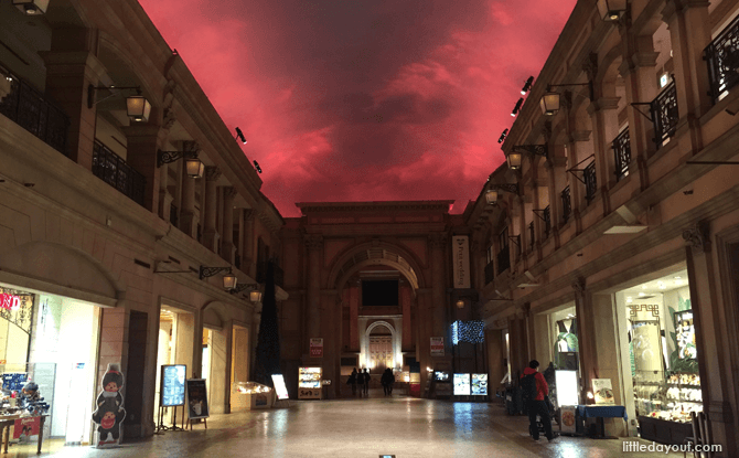 Head to VenusFort at Palette Town for good shopping. The interior of the mall is designed like a European city outdoors, with a dynamic “sky” on the ceiling.