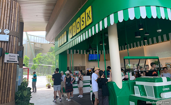 The Shuttle Stops are where visitors can board the free tram service that runs between the Entrance Plaza and Central Plaza. There is also a walking path, Forest Corridor, that runs between the Entrance and Central Plazas.