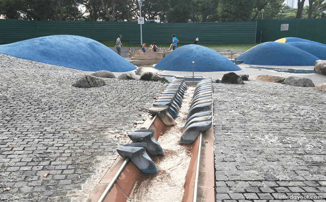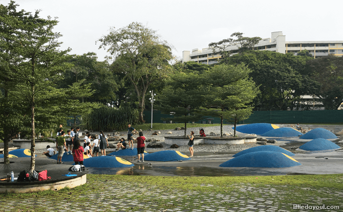 Bishan-Ang Mo Kio Park’s Water Playground also has a little structure with little sprouts of water for kids to play with. Blue, yellow and green mounds dot the water playground’s landscape. These foam mounds contrast with the rocky boulders scattered around the play area.