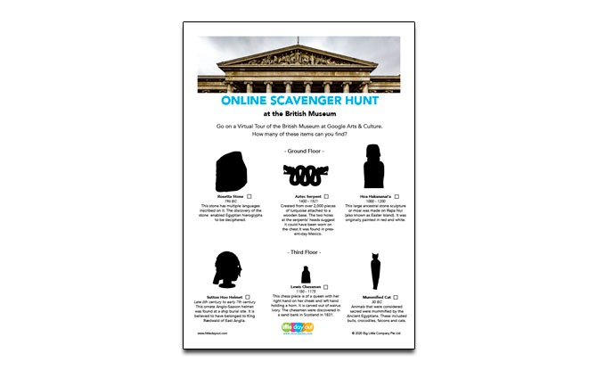 To aid in your virtual exploration of the British Museum, download Little Day Out’s free scavenger hunt activity sheet.