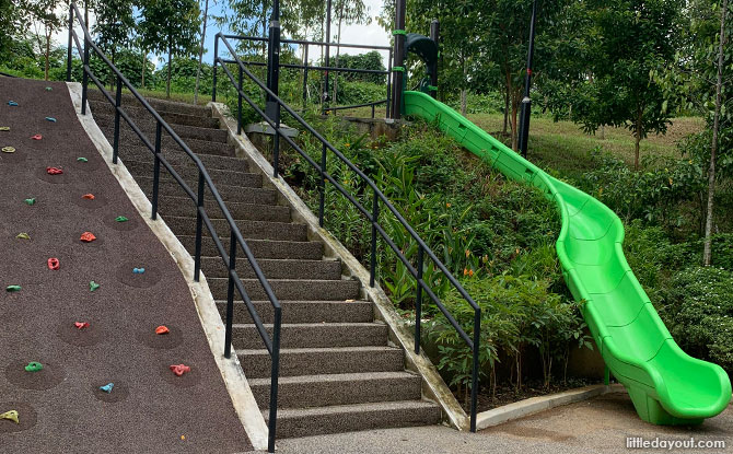 A highlight of the Bukit Gombak Park playground is a green slide which has been built into the slope. Kids can climb up a flight of stairs or scale a slope to reach the top of the slide before letting gravity take them down around.
