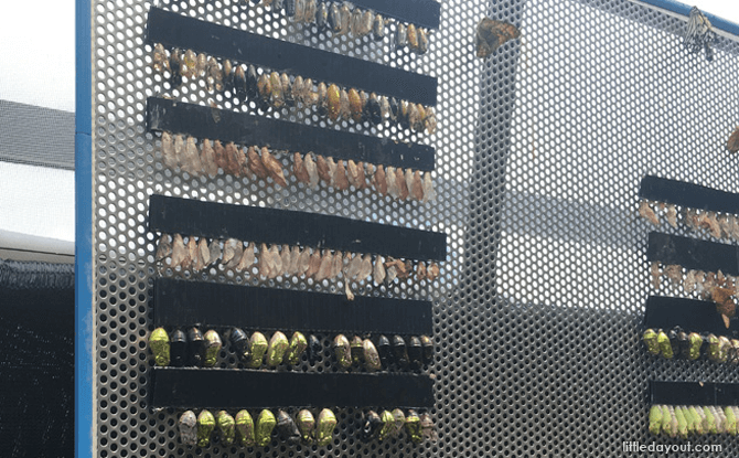 Also along the wall are rows of pupas. If you are lucky, you may even be able to spot a newly minted butterfly, drying out its newfound wings in preparation for its first flight.