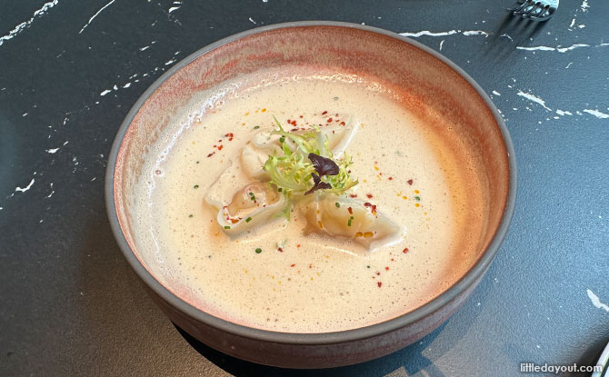 Another outstanding dish was the Scallop Otak Dumplings ($28). The dumplings are presented in a luscious coconut bisque that reminded us of a thick luxurious laksa broth. This velvety soup enveloped the senses with its rich aroma, and it balanced off the firm bite of the dumplings.