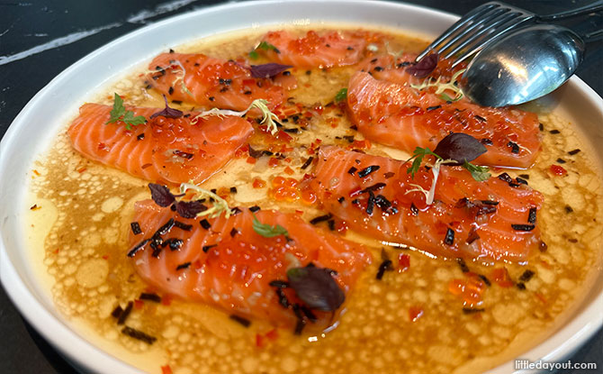 The Ora King Salmon Sashimi ($28) arrived at the table beautifully presented. The dish was a symphony of delicate flavours and artistic presentation. Cut into thin slices, the king salmon sashimi lay gracefully on the plate, adorned with a sauce of chilli, black bean and kalamansi that brought out the freshness of the fish.