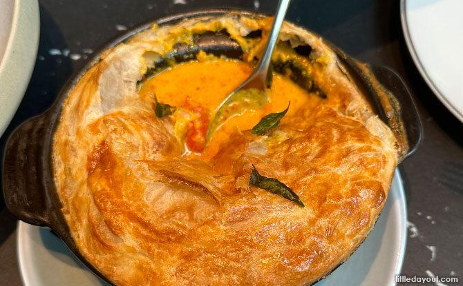 We had high hopes for our first main dish, the Chicken Kapitan Curry Pot Pie ($28). This was a chicken and potato curry with roti pastry shell. We loved the creative presentation that blends together the ideas of a pot pie with a dish as local as curry and prata. However, that was what it tasted like.
