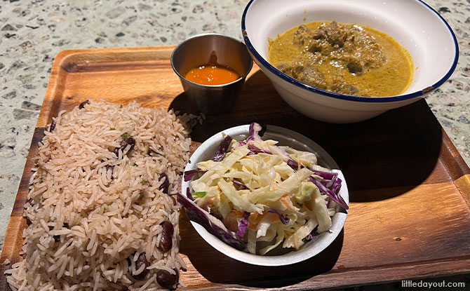 Next, we sampled the Curried Goat, a Trinidadian dish with slow-cooked goat meat in a rich curry sauce. Served with rice and beans and a side of coleslaw, it was hearty and full of flavour. The chilli sauce was also complimented for adding an extra kick of heat and tang.