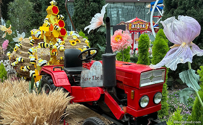 There is a charming red tractor with an entourage of bees behind it. A metal sign reads “Save The Bees”.