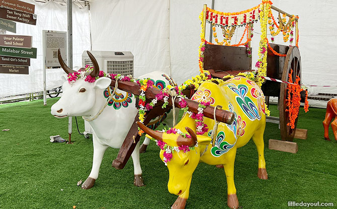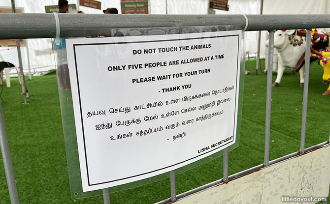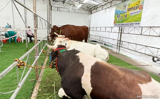 Located in a big white tent, the Little India Cattle Farm offers visitors a chance to see the cattle which have been decorated for the Pongal harvest festival. The cattle have festive garlands around their necks.