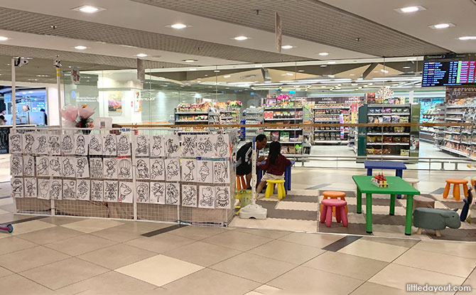 Instead, if you are in the public areas, if you head into the food court at Changi Airport Terminal 4. There is a children’s seating area right at the back, close to the viewing gallery. This children’s area is decorated with pictures of the Toa Payoh dragon playground and the old Pelican playgrounds on the wall.