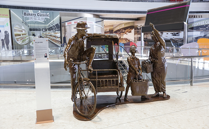 Hey, Ah Chek! is an art piece created by local sculptor and Cultural Medallion winner, Chong Fah Cheong. Drawing inspiration from his childhood memories growing up in the old days of Singapore, Hey, Ah Chek is a slice-of-life scene of a young boy hailing a trishaw with his mother after a trip to the market.