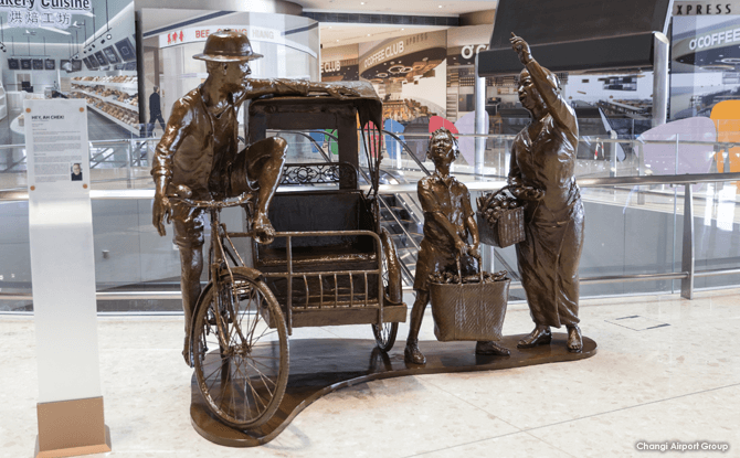 Hey Ah Chek! is a sculpture by local sculptor and Cultural Medallion winner, Chong Fah Cheong. It is a nostalgic depiction of a mother and her son hailing a trishaw for a ride home from the market and harkens back to Singapore of the 1950s. Hey Ah Chek! can be viewed at the Departure Check-in Hall.