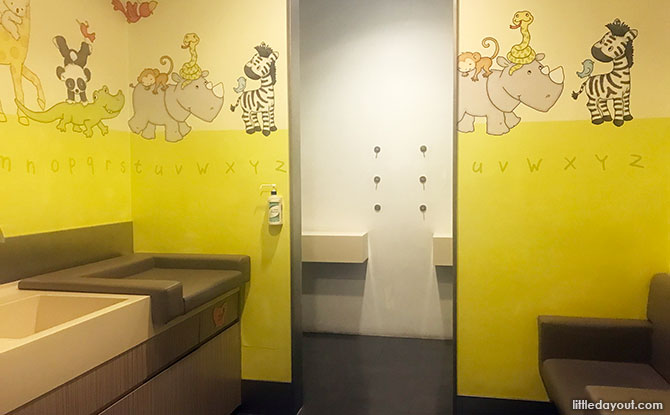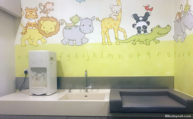 Decorated with cute cartoon images of baby animals, the Parent’s Room at Changi City Point is well-equipped with a sink, hot and cold water dispenser and a padded diaper changing station. There is even a large, comfy sofa for waiting spouses and family members.