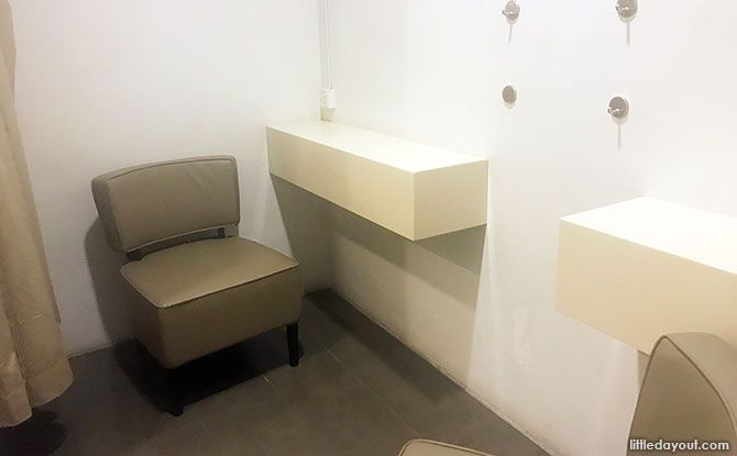The Parent’s Room also contains a separate breastfeeding area which is furnished with two chairs and two electrical points, accommodating two nursing mothers at any given time. There is a curtain which can be drawn for privacy.