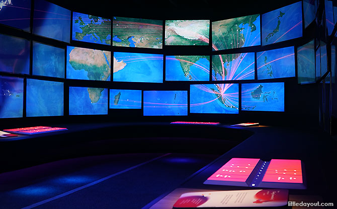 Changi Airport’s connections to the rest of the world come into spotlight at Sky Deck. It is designed to look like an airside operations room, or at least as how we’d imagine it to look like. Use the Travel Guide to learn more about destinations and nodes in the global air travel network.