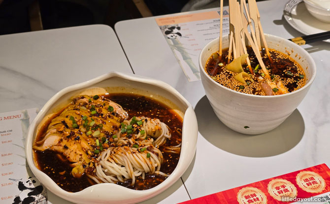 Our first two dishes were cold appetizers – Classic Spicy Assorted Skewers in Red Chilli Oil (S$14.80) and Sichuan Chilli Chicken with Ramen (S$16.80).