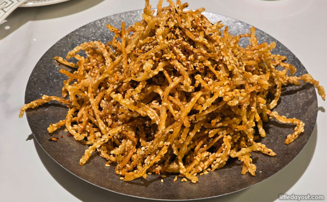 Next was Volcano Crispy Shredded Potatoes with Secret Seasoning (S$12.80), a pile of matchstick sized crispies coated with sesame seeds. The best snack ever! It was not volcano-level spicy so it must have been referring to its shape. It was crunchy and light, not greasy at all. Evenly and well-seasoned but not heavy-handed.
