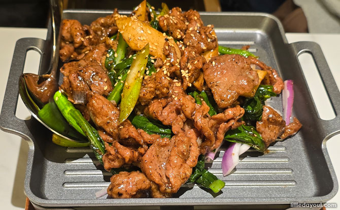 We were then treated to Sizzling Mulan Beef on Hotplate (S$23.80), a dish featuring beef, oyster mushrooms and kailan, coated in a deep, umami-rich black pepper sauce.