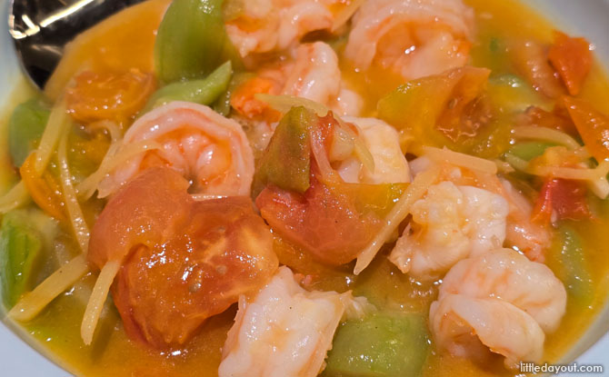 A simple but still flavourful stew of prawns with luffa, otherwise known as silk gourd, is a good option if you would like more kid-friendly dishes.