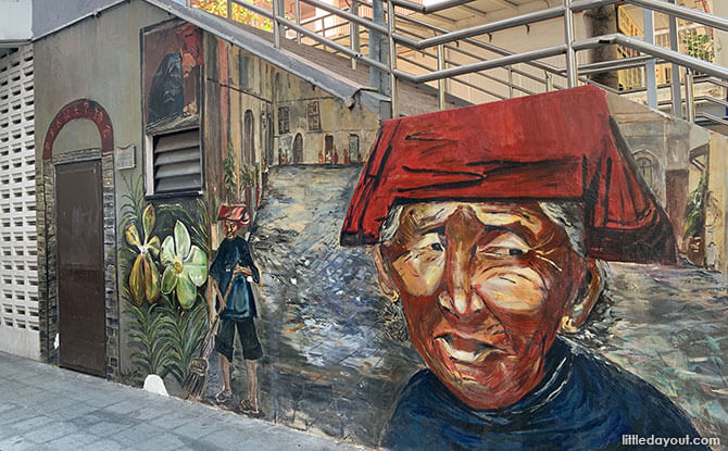 If you venture across South Bridge Road to Mohamed Ali Lane, you will come across a set of three murals painted on the walls of a shophouse. These depict a lion dance costume maker, a mama shop and a street vendor selling masks.