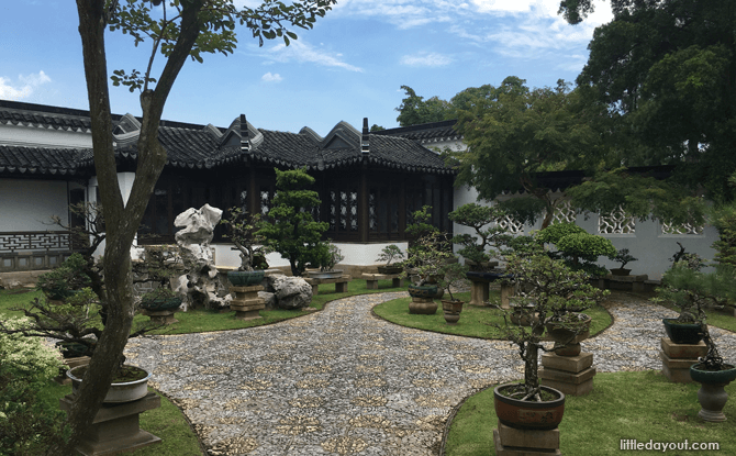 Other than the many plants around the courtyards, a unique spot within the walled Bonsai Garden is a pavilion situated on a rocky crag. Paths lead up to it from either side.