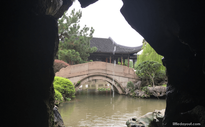 The Chinese Garden is linked to the neighbouring Japanese Garden by a white arch bridge.