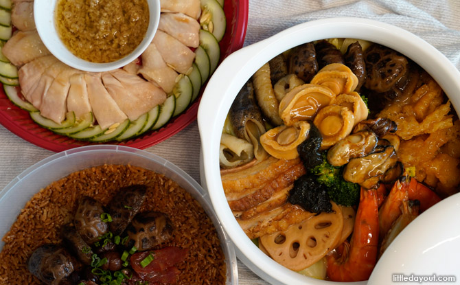 Each set includes Baby Abalone with Crispy Yam and Longan Yu Sheng, Samsui Ginger Chicken, Braised Abalone Seafood Pot with Dried Oysters (new) and Traditional Steamed Rice with Chinese Sausage.