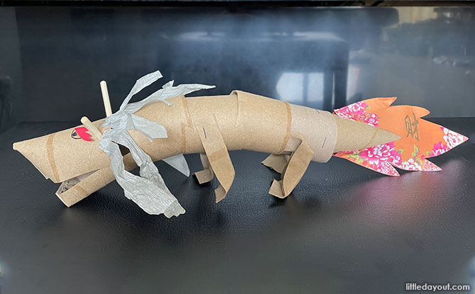 Created out of paper towel rolls, disposable chopstick, crepe paper and angpow packets, this dragon Chinese New Year craft results in a 3D model that is perfect for the Year of the Dragon.