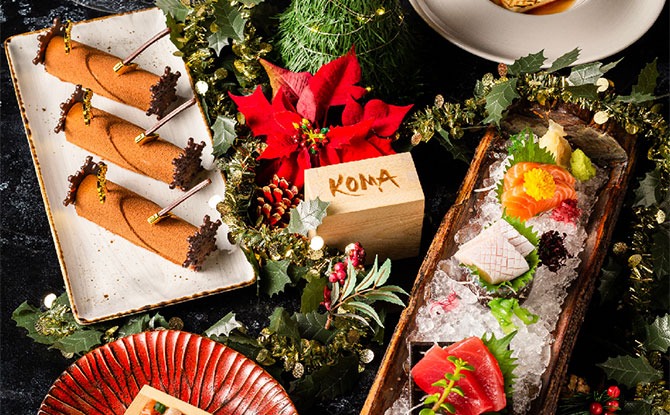 Diners can also indulge in KOMA’s sushi jewel box, a decadent chirashi don with five types of fish. End the meal on a festive note with KOMA’s Christmas log cake which is coated with Manjari dark chocolate mousse, vanilla crémeux and a light burst of nashi pear jelly.