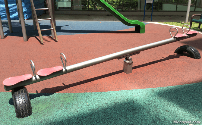 The play area also has an old-style see-saw, complete with rubber tires as stoppers below the ends.