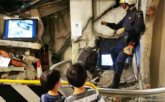Tools such as power saws, spreaders to lift fallen concrete slabs, air bags can also be seen. We were quite amused by a barking rescue dog capable of using their keen sense of smell to assist the SCDF personnel.